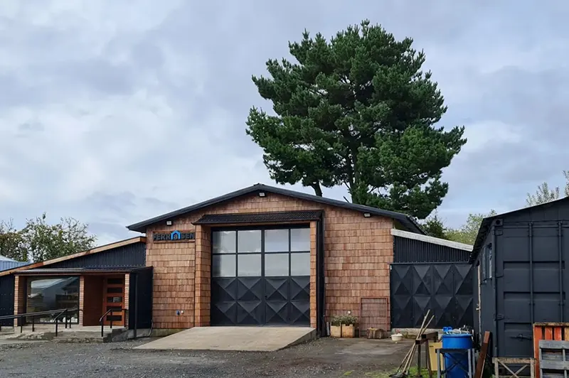 El galón principal a dos aguas alberga la zona de bodegaje mayor y la parte de entrega de la sale de ventas, con una mayor altura que permite el libre manejo de las maquinarias que se necesitas en este rubro. Los volúmenes laterales de menor altura, acogen la sala de ventas y servicio de personal, además de bodegaje menor. La distribución interior permite un buen control de los materiales y del personal, entregando el espacio e iluminación necesaria para cada actividad.